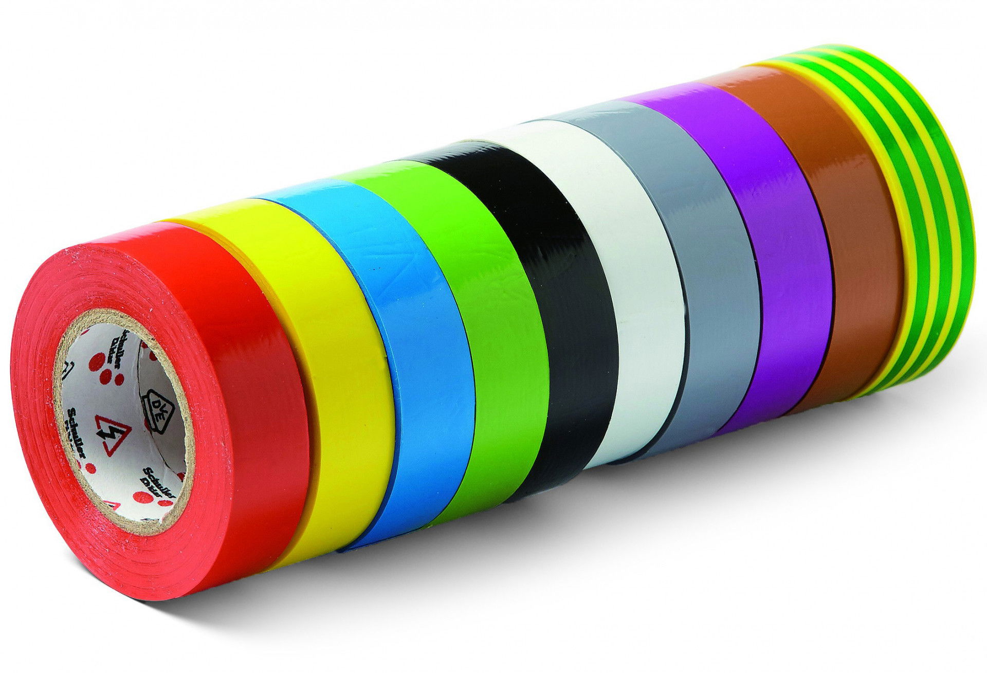 A készlet 1-1 darabot tatalmaz a következő színű szigetelőszalagokból: piros, sárga, kék, zöld, fekete, fehér, szürke, viola, barna és sárga/zöld (földelés).